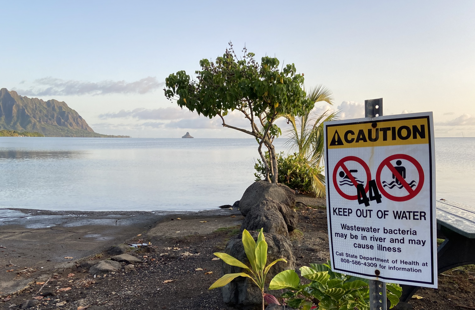 Caution signs at Kahaluʻu warn of wastewater pollution. The state has a 2050 deadline to eliminate cesspools, but many homeowners are struggling to cover conversion costs. (Courtesy: Surfrider Foundation/2022)
