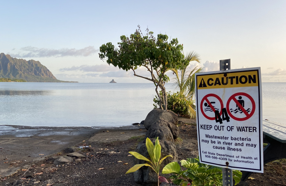 A sign warns of health hazards at Kahaluu due to cesspool pollution. (Courtesy: Surfrider Foundation/2022)