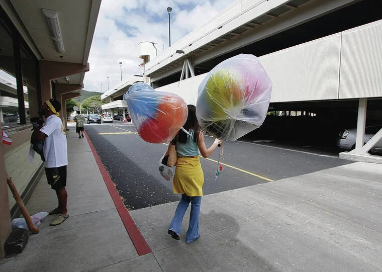 State lawmakers passed balloon legislation in 2021 that went into effect this month making it illegal to release balloons into the atmosphere. A woman at Kahala Mall clings to two large plastic bags containing inflated balloons for her children’s birthday party.